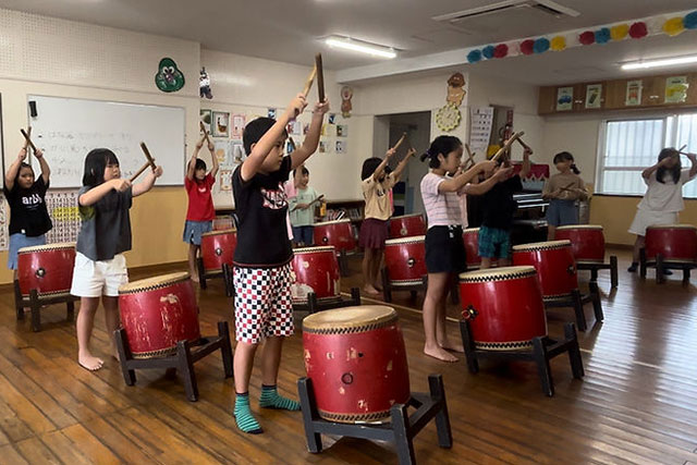 学童クラブで、週に1度、外部講師を招いて和太鼓教室を取り入れています。